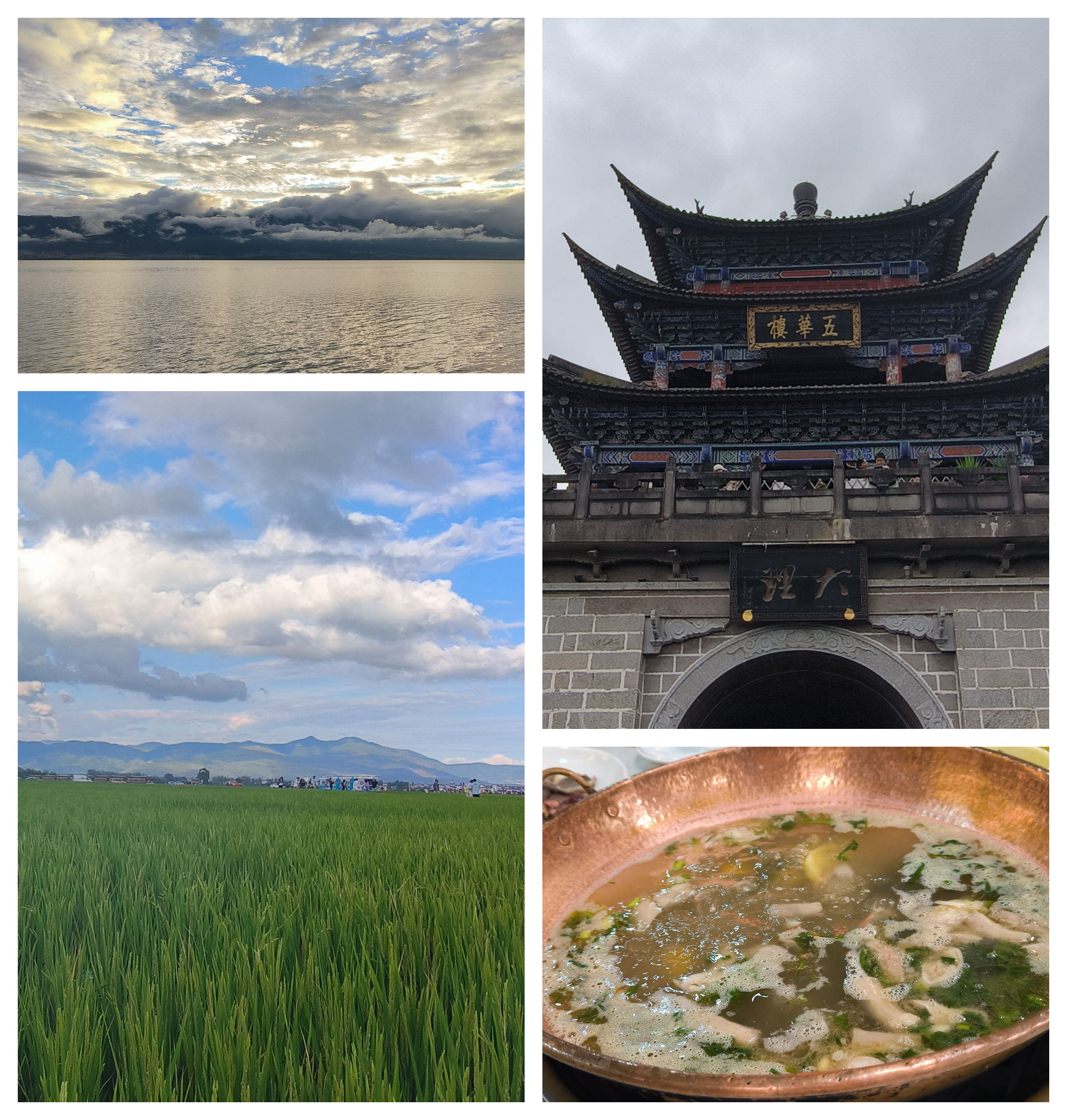 大观楼公园的晨露未晞,我们已驱车奔向“风花雪月”的传说。车抵大理,苍山如屏,洱海如镜。暮色四合时,洱海落日熔金,镜头里盛满洱海的温柔。古城青石板路回荡着稚嫩的笑声,洱海骑行时,闺女指着远处的白族村落惊呼:“妈妈,云朵掉进水里了!”喜洲古镇的稻田翻起阵阵绿波,白族铜瓢牛肉火锅的香气混着晚风,成了“最好吃的牛肉汤”。