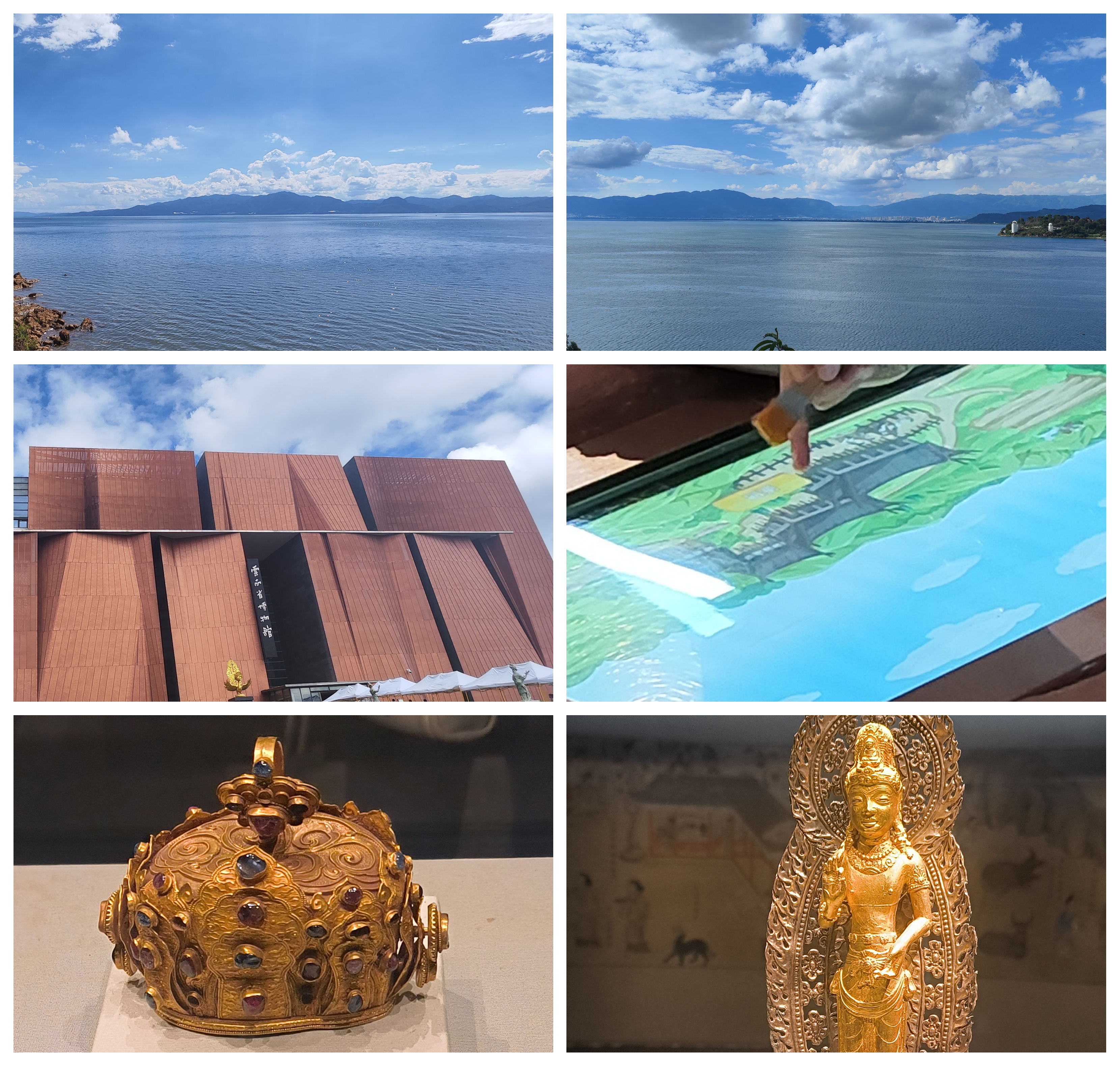 午后三时的抚仙湖,天空与湖水共同演绎着一场蓝色的交响曲,澄澈的苍穹如洗过的蓝宝石,云絮被阳光揉碎成缕缕银纱,慵懒地漂浮在穹顶。湖面则呈现出更为深邃的靛蓝,仿佛将整片天空的蓝意尽数吸纳。旅程尾声,在考古馆浅浅的体验了考古流程,云南省博物馆的牛虎铜案让儿子睁大眼睛,返程前夜,孩子们对话“云南有会发光的湖、会跳舞的菜,还有会讲故事的石头……”