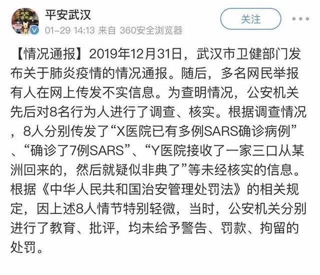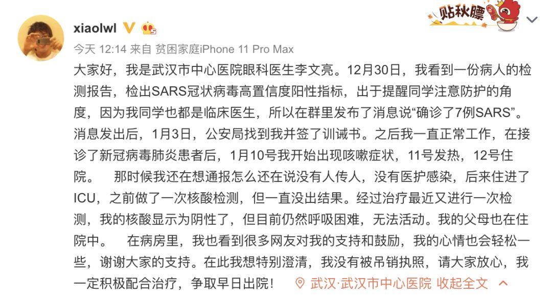 更没想到的是,他还上了……↓Yang视新闻直播间通报「8名散播谣言者被查处」。李文亮接到武汉市某分局某派出所电话,要求他去签《训诫书》。李文亮在采访中提到,自己“以前也没和警察打过交道,我当时也很担心,不签的话怕不能脱身,我去了走完流程就签字走了。”1、「公安机关希望你积极配合工作,听从民警的规劝,至此中止违法行为。你能做到吗?」2、「我们希望你冷静下来好好反思,并郑重告诫你:如果你固执己见,不思悔改,继续进行违法活动,你将会受到法律的制裁!你听明白了吗?」李文亮坦言,当时压力比较大,也没和家里人说,因为担心受到医院处罚,会影响以后工作晋升之类的。当时网上有人传言,李文亮已被「吊销执照」,此为真正谣言。这场风波之后,李文亮小心保守着这个“秘密”和担心,继续在医院工作。李文亮接诊了一位82岁的女性患者,病症为急性闭角型青光眼。医院当时没有要求他们科室做特殊防护,且病人无发热症状,李文亮坦言说自己当时大意了。此女性患者开始发烧,CT检查之后,李文亮高度怀疑,她是病毒性肺炎。但当时医院没有用于检测确诊病人的试剂盒,并非确诊。李文亮开始出现轻微咳嗽症状,他开始佩戴N95口罩。李文亮做了呼吸道病毒检查和CT检查,高度怀疑是新冠病毒肺炎,于是住院。李文亮的父母,也相继出现症状并住院。(目前已好转出院)后来李文亮病情经历一次恶化,住进了重症监护室,每天都要打抗生素、抗病毒,球蛋白和吸氧。李文亮在微博中发文:“经过治疗最近又进行一次检测,我的核酸显示为阴性了,但目前仍然呼吸困难,无法活动。”说实话,写这个话题,需要极大的克制,李文亮医生在接受@南方都市报采访时说的这样一句话:李文亮:恢复以后还是要上一线,疫情还在扩散,不想当逃兵!至于疫情以后的事,还没想太多。李文亮医生一句“上一线,不当逃兵”,让我们看到一个医务工作者,在经历了如此巨大的精神委屈和病痛折磨之后,依然能够说出这种慷慨奔赴战场的话,我们又怎能瞻前顾后,在乎那点所谓私心?这句话,不是我说的,而是在17年前,一位勇敢发声的J医生说的。前天的文章发不出来,我猜很大可能是因为提到了这段历史。为了防止这篇文章面对同样命运,我这里不做展开了,辛苦大家自行搜索了解即可。就像李文亮医生的所谓“谣言”,如果掰开了认真分析,“确诊7例SARS”当然是不准确的,但他后来也做了明确补充,是“冠状病毒,还需分型”,这种“谣言”,绝非凭空捏造的不实信息。假如当时,有更多的人“听信”了李医生的“谣言”,开始戴口罩,开始隔离,开始防护,而不是依然毫无所知地让自己暴露在这个病毒环绕的空气中。毫无依据、凭空捏造、添油加醋、良心大大的坏了的谣言,一定人人喊打;但基本符合事实、没有私心坏心、甚至对人民有益的“谣言”,则要给予更多的理性关注和适度宽容。毕竟,我们打击谣言,是为了让这个社会更安定更和谐,而完全一概而论的打击,则可能让所有人,都开始「噤若寒蝉」,没有人愿发声,敢发声。3、李文亮医生说,“真相比平反重要”,但我们想说,「平反」同样重要李文亮医生在采访中被问到:“你想过以后会不会走司法途径,来要个说法?”他回答:“没有,司法途径恐怕很麻烦,我不想跟GA找麻烦,我很怕麻烦。大家知道真相更重要,平反对我而言不那么重要了,公道自在人心”。