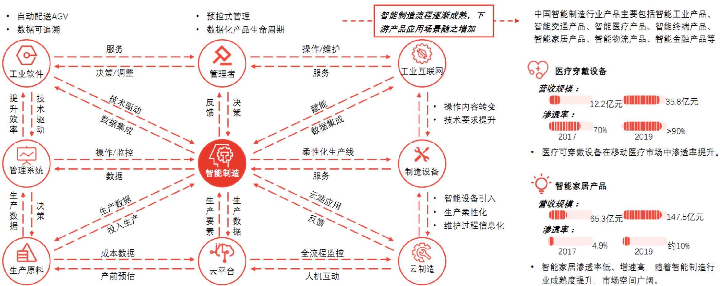受上述技术驱动,智能制造的管理系统、制造设备环节以及人工智能决策等过程效率提升.应用场景增加。