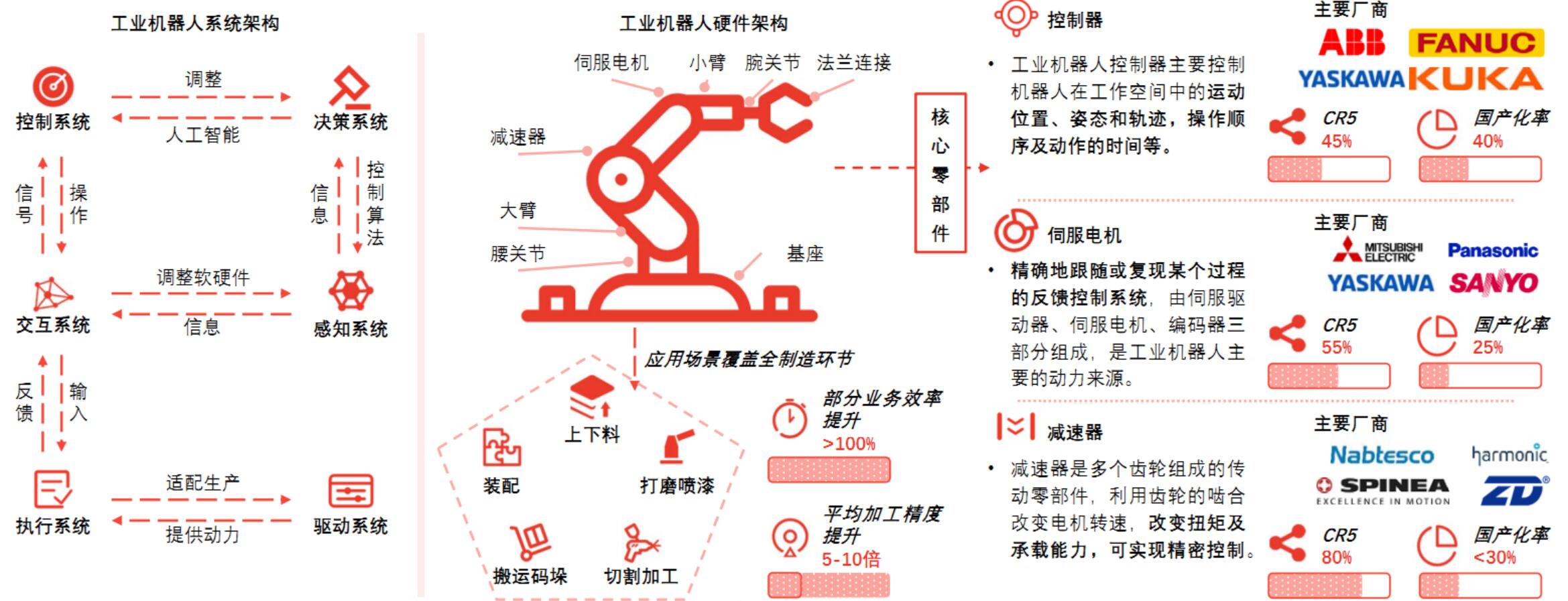 工业机器人是面向工业领域,通过编程或示教方式实现自动化,同时具备拟人形态及功能的机械装置。其常见形态为多关节机械手或多自由度的机器装置,可靠自身动力和控制能力来实现各种功能。