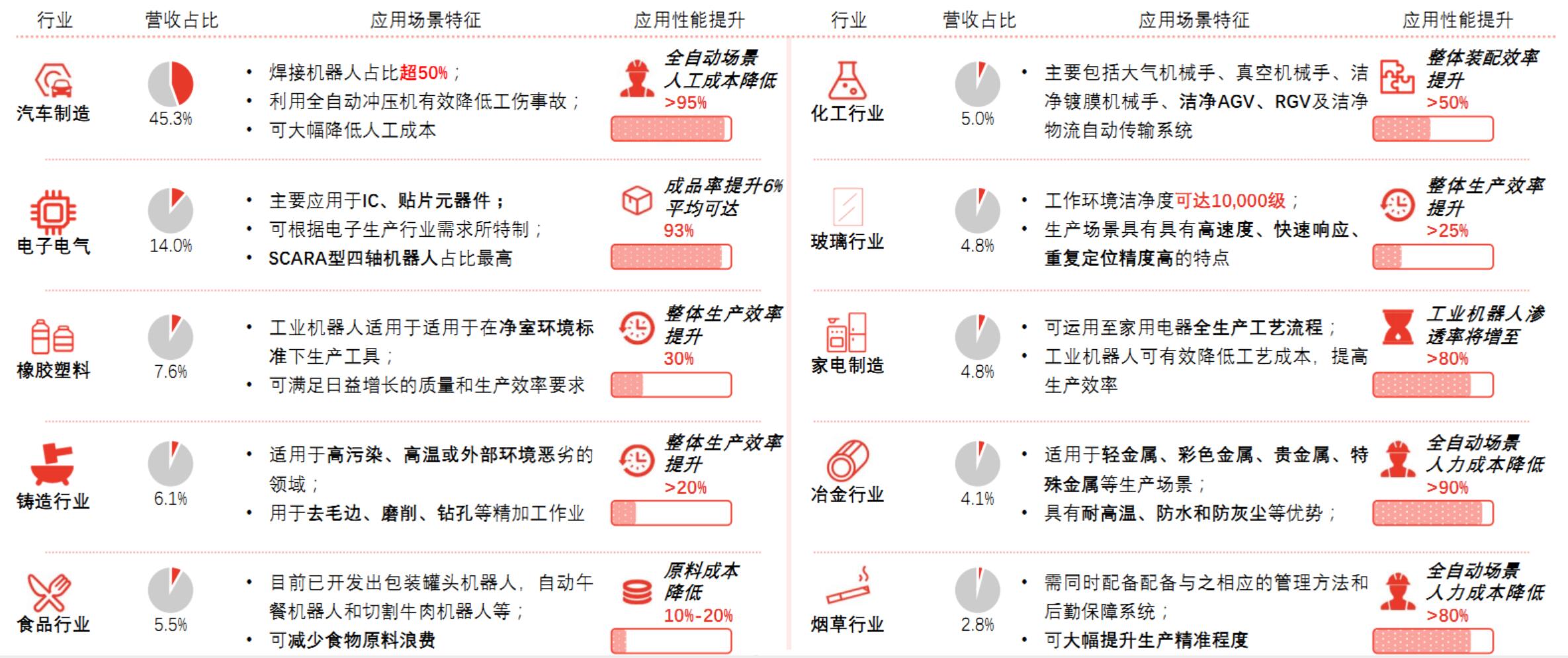 中国工业机器人下游集中于汽车制造、电子电气、橡胶塑料、铸造行业、食品行业、化工行业、玻璃行业、家电制造、冶金行业、烟草行业等10个应用场景。