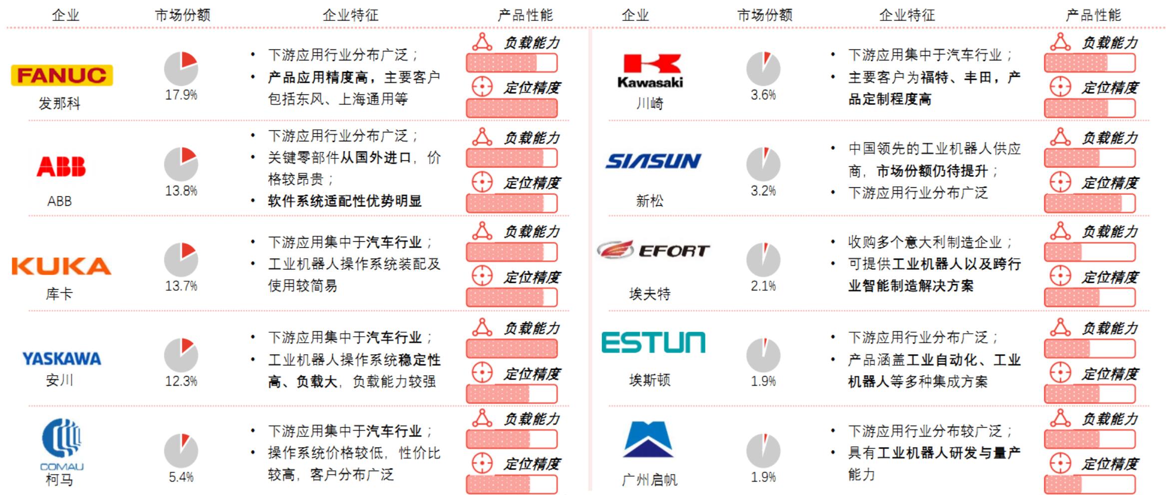 中国工业机器人头部企业包括发那科、ABB、库卡、安川、柯马、川崎、新松、埃夫特、埃斯顿、广州启帆等企业。