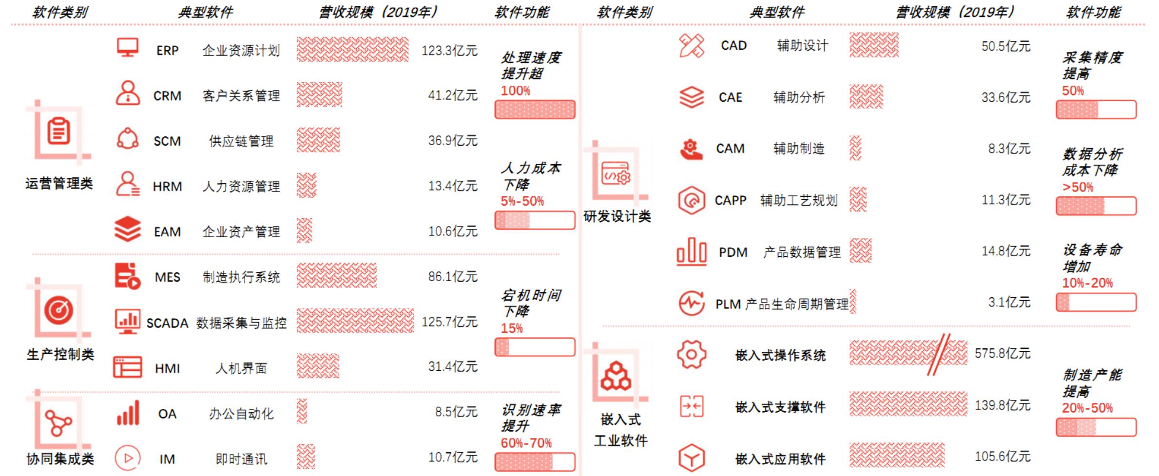 工业软件可分为运营管理、生产控制、研发设计、协同集成、嵌入式等类别;