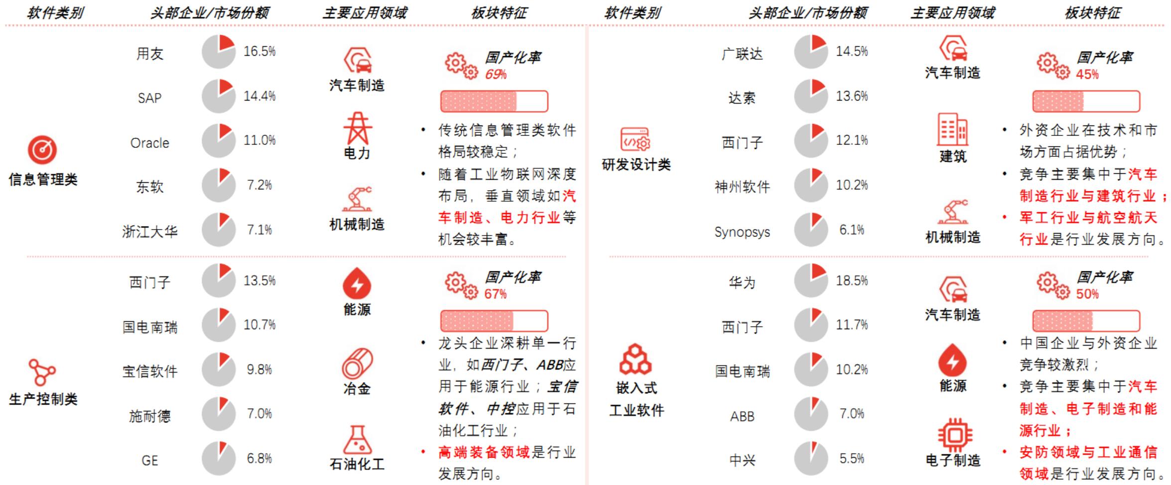 中国工业软件行业竞争格局可主要分为研发设计类、生产控制类、信息管理类以及嵌入式工业软件4个版块。