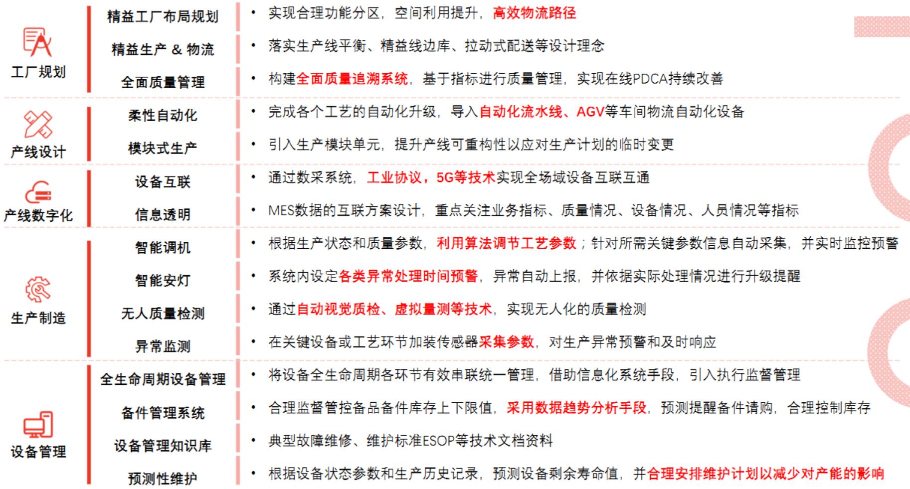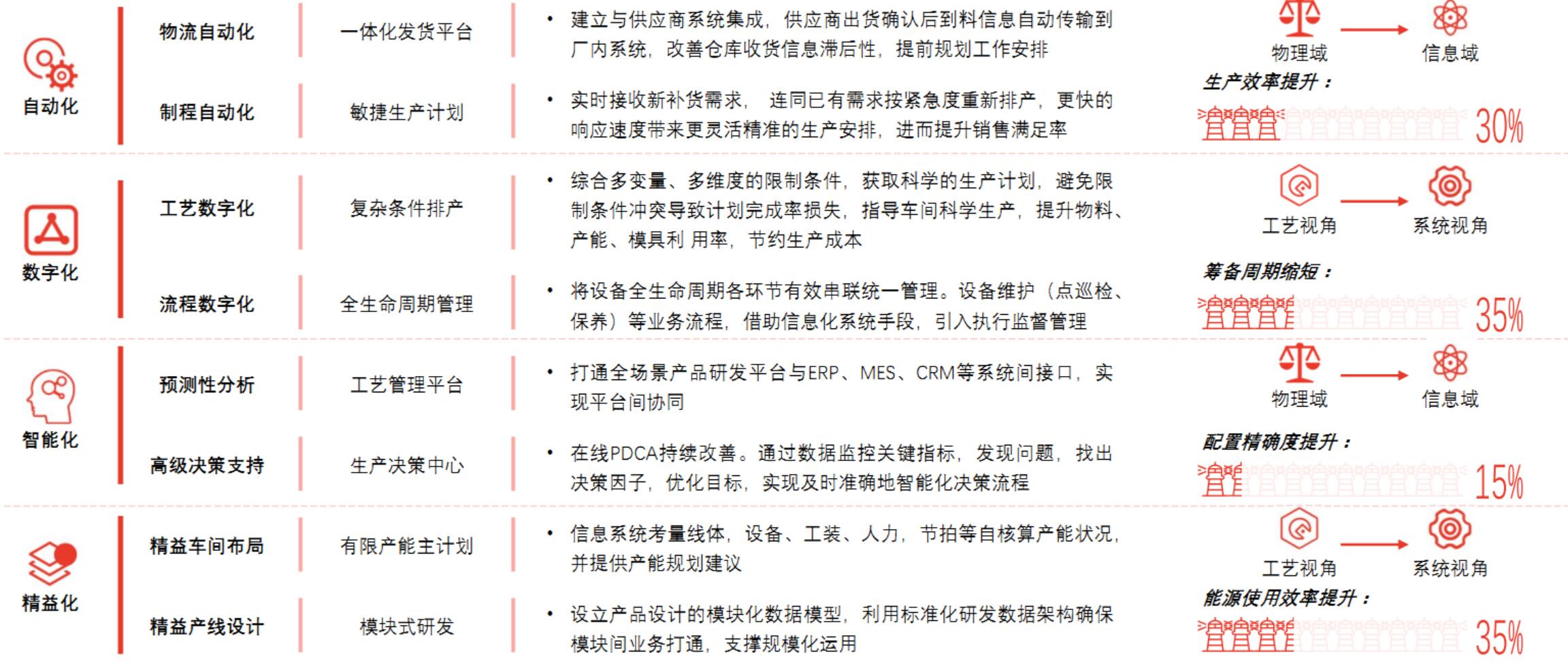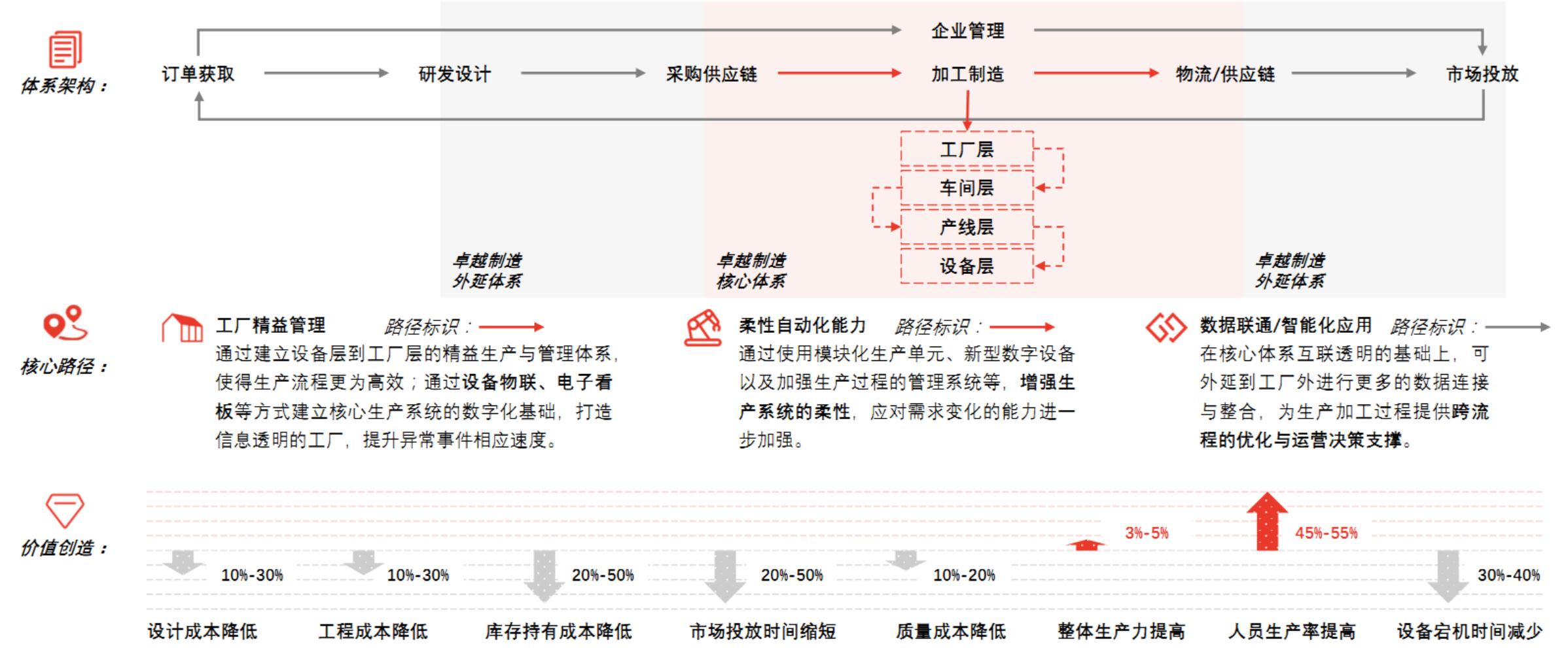 卓越制造体系是以生产制造为中心的转型升级;以精益制造为基础,通过提升柔性自动化能力、打通工厂内外数据、推行智能化应用等路径,优化核心生产系统。