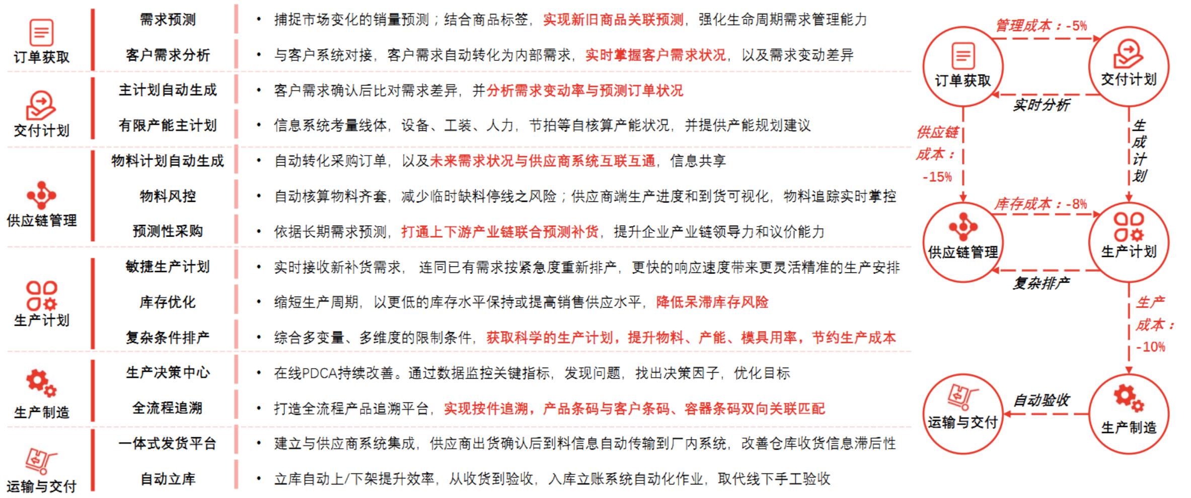 打通端到端敏捷供应链。从客户订单管理,主生产计划和物料需求计划、采购订单管理到供应商库存和出货管理协同共享。