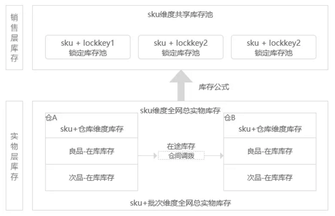 销售层库存建立在实物层库存的基础之上,它们通过库存公式相连接,确保了仓内实物数量发生变更时、营销端的销售层库存也相应变更。