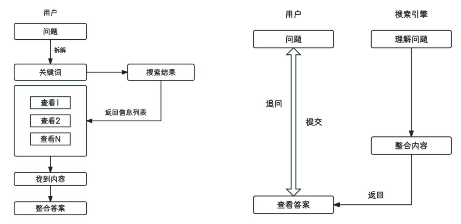 信息获取方式对比:传统搜索(左)与 AI 搜索(右)