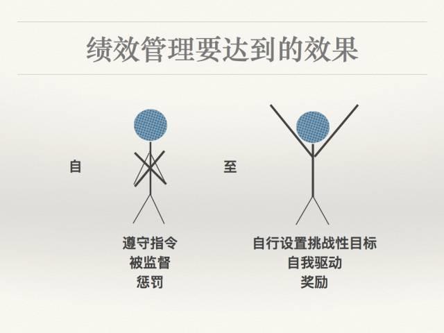 大家看下面的图,可以很明显地感到激励X理论和Y理论的差别。大家可以试着做一个动作,把你的双臂交叉成X在你的胸前,你们会感受到什么?保护、抗拒、束缚、不自由……大家试想一下,如果员工在接受指令,被监督,惩罚机制主导的绩效制度下,大家自然的感觉就会是X的状态,主管要求什么就只做什么,做多了可能出错,会受到惩罚,上班就想着快点下班,有很强的防备意识,抵触情绪。在这种情形下,可想而知,绩效管理的效果如何了。 接下来大家再把你们的双臂向上尽量展开,呈现Y字形,大家感受到了什么?绽放、自由、蓬勃向上、渴望、潜力无限,你会感到从胸前生出的一种力量,充满热情和渴望投入。在这种Y型状态下,员工会自行设置挑战性目标,自我驱动,自我管理,自我约束,员工需要更多的鼓励、奖励、回报,而更少惩罚。大家试想,如果一个组织大多数员工都激发出这种Y型状态,企业的目标达成,业务推进,开创和创新的状态和结果一定是一个令人鼓舞的状态。所以,要做好绩效管理,企业中的管理者一定要激发员工到Y的状态,这样才能最大化地发挥绩效管理的效果。