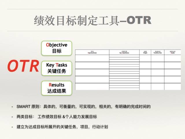 这里,我想给大家介绍一个目标设定的工具,给它命名个简称就是“OTR”, 就是目标,关键任务/关键行动,结果达成。 简单的三部分,Objective — Key Tasks — Results。一个目标“O”本身就要设置的SMART,有具体的可衡量的有时间要求的期望产出;为了达成这个目标“O”,一定要列出相关的多个关键任务 “T”,就如同战略路径Roadmap,作为桥梁,来具体地支撑这个目标,使之可实现。定期追踪衡量目标达成的进展,达成关键的阶段性的里程碑,这样,目标达成就被这些关键任务实实在在地具体支撑住了。最后进行绩效评估时,对 “R” 即目标达成结果情况的评估。
