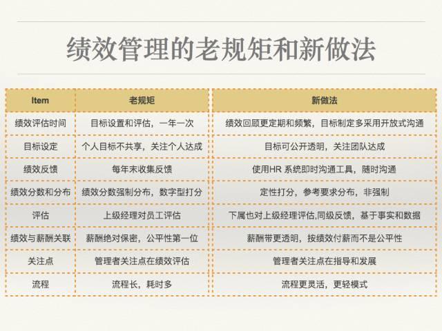 绩效管理并不是一个新话题,咱们来看看绩效管理过去的老规矩和现在的新做法吧。从下图可以看出,现在的企业,尤其是互联网公司,在绩效管理各个环节的操作方式和过去有了很大不同。现在大家倾向于用更快、更轻、体验更好的方式和方法,频度更高地进行双向绩效目标制定、绩效沟通和回顾,组织目标的达成过程中也更加强调团队的协同,员工能力的发展,通过完成具有挑战性的工作任务来发展员工能力,并把公司的价值观融入员工做事的行为要求中,更加透明,关注结果达成的同时,更加关注过程和行为(体现了领导力和价值观)。
